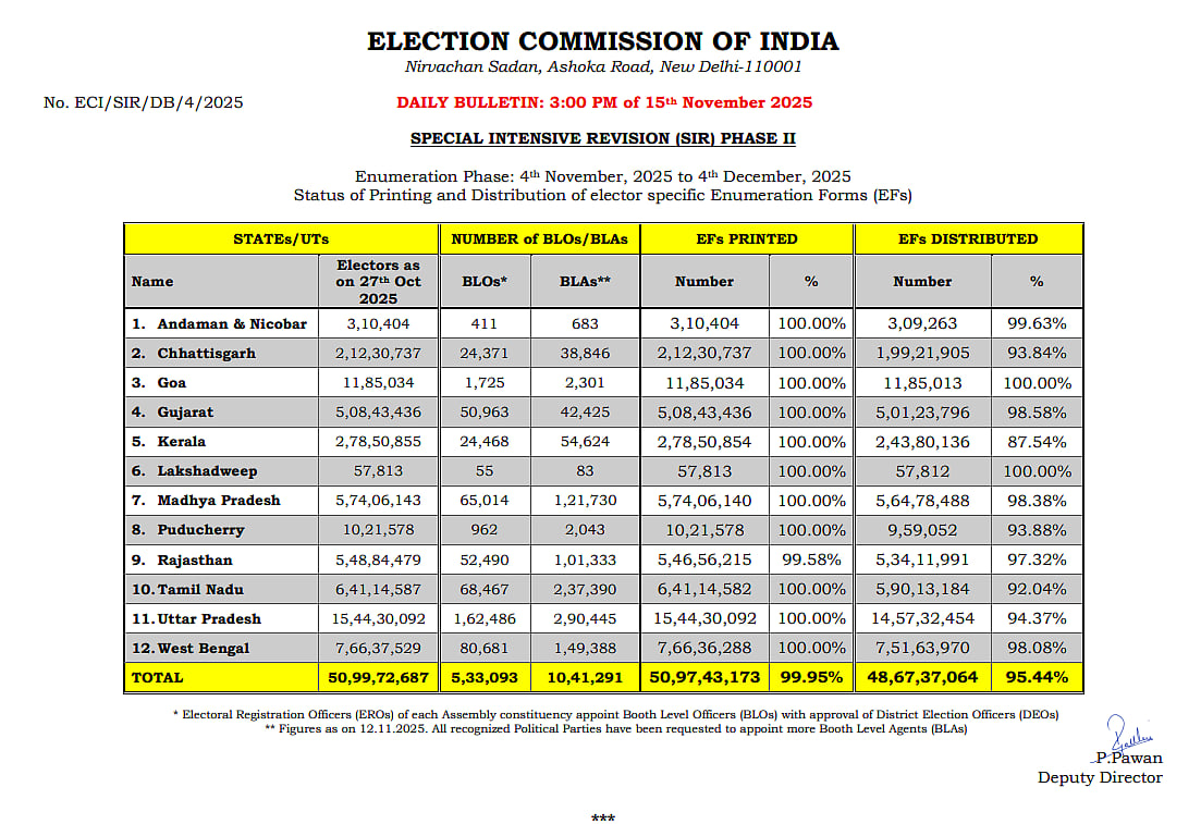 சத்தீஸ்கர், குஜராத், மத்திய பிரதேசம், ராஜஸ்தான், உத்தரப் பிரதேசம், மேற்குவங்கம் ஆகிய மாநிலங்களிலும் எஸ்ஐஆர் படிவங்கள் வழங்கும் பணிகள் 90%க்கு மேல் முடிந்துவிட்டதாகவும் தெரிவிக்கப்பட்டுள்ளது.