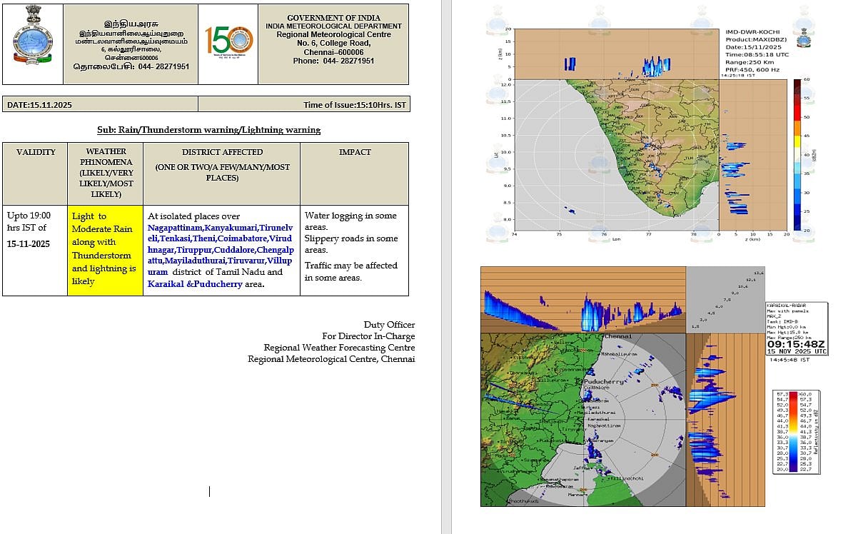 தென்மேற்கு வங்கக்கடல் பகுதிகளில் இன்று(நவ. 15) ஒரு காற்றழுத்த தாழ்வு பகுதி உருவாகியுள்ளது. இதன் காரணமாக, தமிழகத்தில் ஓரிரு இடங்களிலும், புதுவை மற்றும் காரைக்கால் பகுதிகளிலும் சனிக்கிழமை இடி, மின்னலுடன் கூடிய லேசானது முதல் மிதமான மழை பெய்யக்கூடும் என்று வானிலை ஆய்வு மையம் ஏற்கனேவே கூறியிருந்தது.