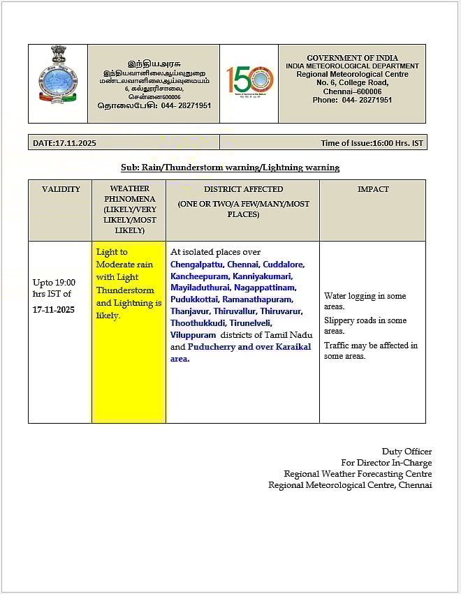 இதன் காரணமாக, இன்று(நவ. 17) கடலோர தமிழகத்தில் அநேக இடங்களிலும், உள் தமிழகத்தில் ஒருசில இடங்களிலும், புதுவை மற்றும் காரைக்கால் பகுதிகளிலும், இடி, மின்னலுடன் கூடிய லேசானது முதல் மிதமான மழை பெய்யக்கூடும் என்று தெரிவிக்கப்பட்டுள்ளது.
