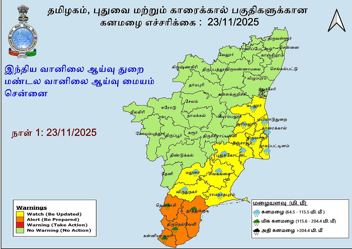நெல்லை, தூத்துக்குடி, தென்காசி, கன்னியாகுமரி ஆகிய 4 மாவட்டங்களுக்கு இன்று(நவ.23) மிக கனமழைக்கான ஆரஞ்சு எச்சரிக்கை விடுக்கப்பட்டுள்ளது