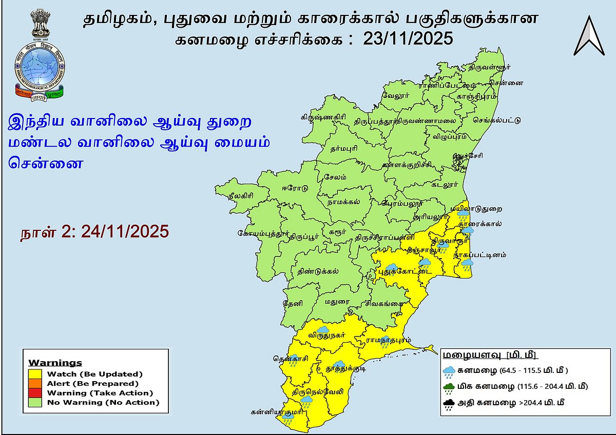 நாளை(நவ. 24) நெல்லை, தூத்துக்குடி, தென்காசி, கன்னியாகுமரி, ராமநாதபுரம், விருதுநகர், புதுக்கோட்டை தஞ்சாவூர், திருவாரூர். நாகப்பட்டினம், மயிலாடுதுறை மற்றும் காரைக்கால் பகுதிகளில் கனமழை பெய்ய வாய்ப்புள்ளதாக(மஞ்சள் எச்சரிக்கை) வானிலை ஆய்வு மையம் கூறியுள்ளது.