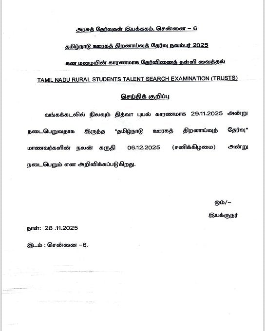 இந்நிலையில் டிட்வா புயலால் தமிழ்நாட்டில் பல்வேறு மாவட்டங்களுக்கு கனமழை எச்சரிக்கை விடுக்கப்பட்டுள்ளதையடுத்து தமிழ்நாடு ஊரக திறனாய்வு தேர்வு டிச. 6 ஆம் தேதி, சனிக்கிழமைக்கு மாற்றப்பட்டுள்ளதாக அரசுத் தேர்வுகள் இயக்ககம் அறிவித்துள்ளது.