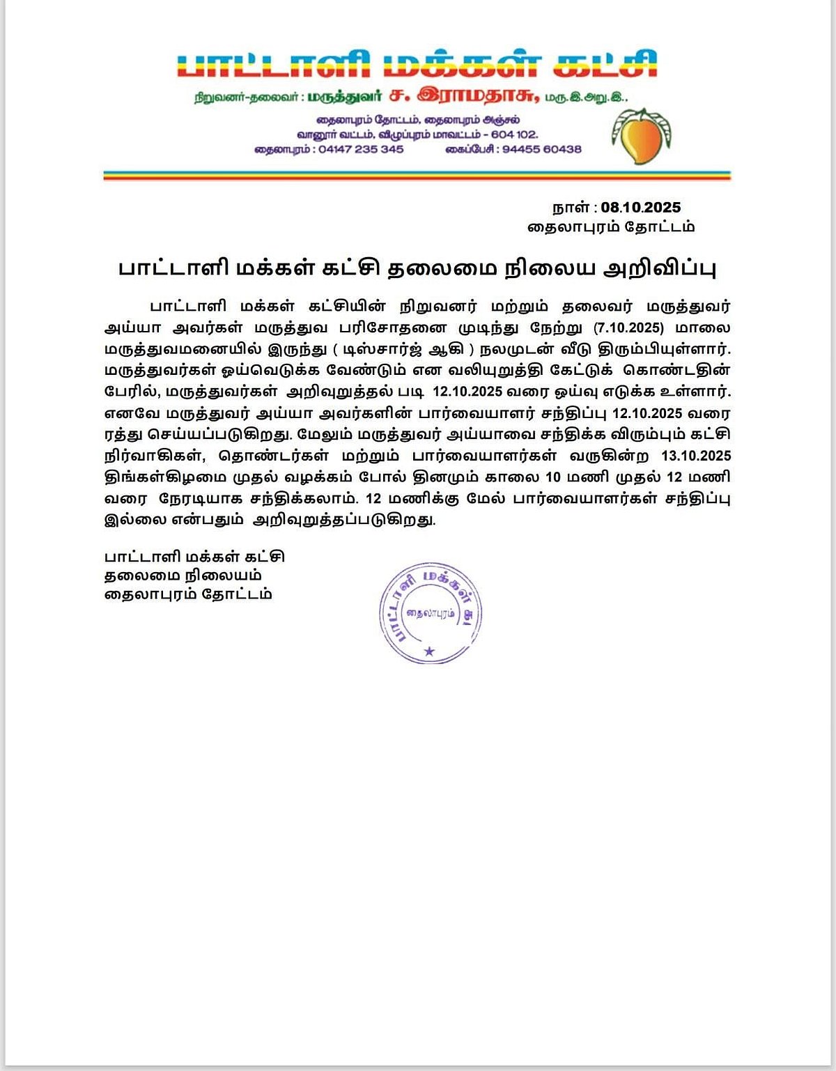 மருத்துவர்கள் ஓய்வெடுக்க வேண்டும் என வலியுறுத்தி கேட்டுக் கொண்டதின் பேரில், மருத்துவர்கள் அறிவுறுத்தல் படி 12.10.2025 வரை ஒய்வு எடுக்க உள்ளார். எனவே ராமதாஸின் பார்வையாளர் சந்திப்பு 12.10.2025 வரை ரத்து செய்யப்படுகிறது.