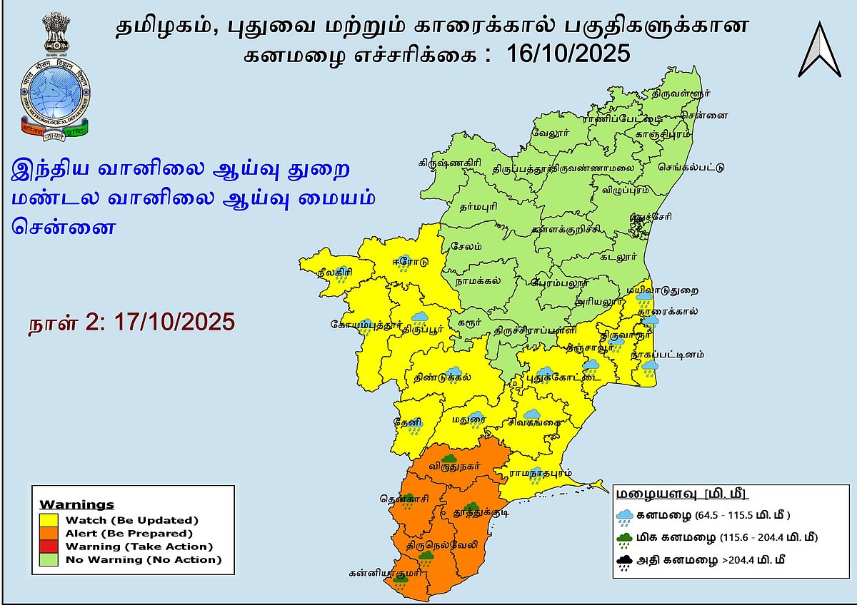 நாளை(அக். 17) நெல்லை, தூத்துக்குடி, தென்காசி, கன்னியாகுமரி, விருதுநகர் ஆகிய 5 மாவட்டங்களுக்கு மிக கனமழைக்கான ஆரஞ்சு எச்சரிக்கை விடுக்கப்பட்டுள்ளது.