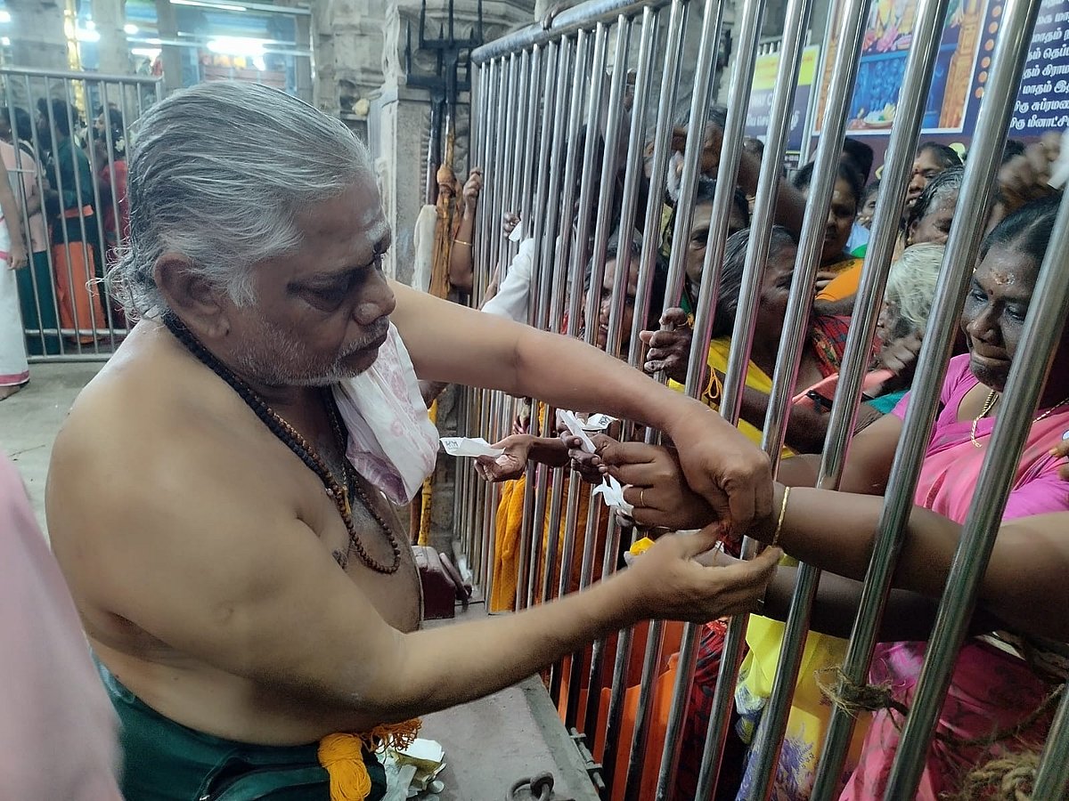 சஷ்டி விரதமிருக்கும் பக்தர்களுக்கு காப்பு கட்டும் சிவாச்சாரியார்