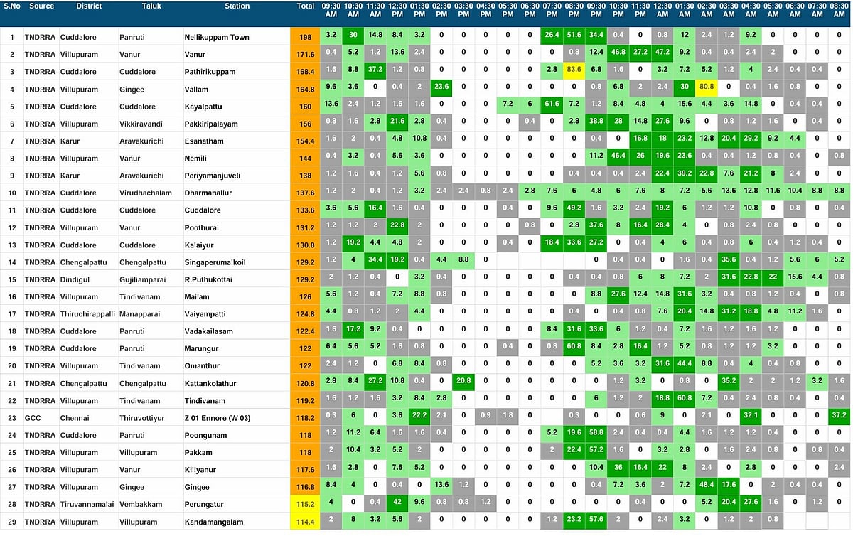 தமிழகத்தைப் பொறுத்தவரை கடலூர் மாவட்டம், பண்ருட்டி தாலுகா, நெல்லிக்குப்பத்தில் அதிகபட்சமாக 198 மி.மீ. மழை பதிவாகியுள்ளது. விழுப்புரம் வாணூரில் 171 மி.மீ., கடலூர் பத்திரிகுப்பத்தில் 168 மி.மீ. மழை பதிவாகியுள்ளது.