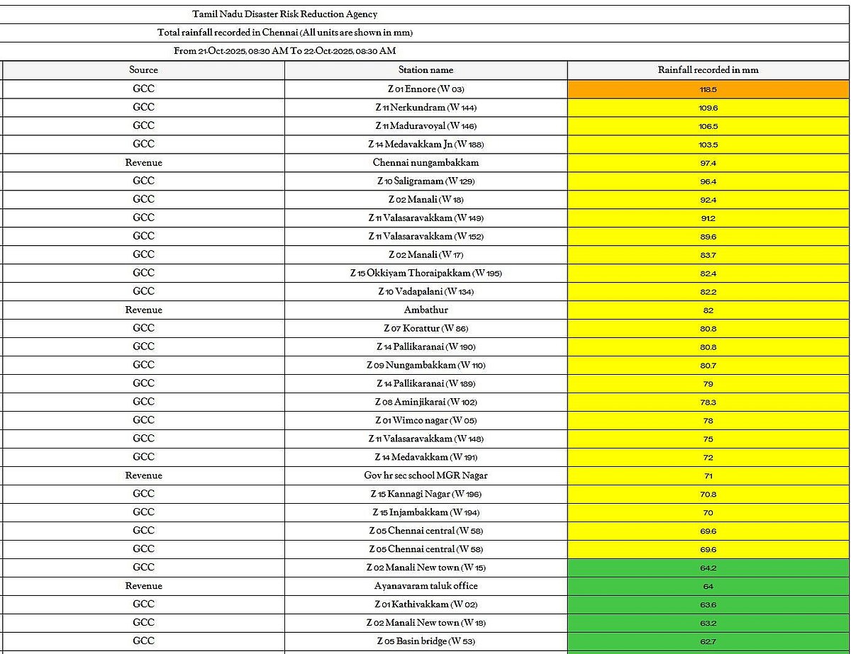 சென்னையைப் பொறுத்தவரை அதிகபட்சமாக எண்ணூரில் 118 மி.மீ. மழை பதிவாகியுள்ளது. நெற்குன்றத்தில் 110 மி.மீ., மதுரவாயலில் 106 மி.மீ., மேடவாக்கத்தில் 103 மி.மீ., நுங்கம்பாக்கத்தில் 97 மி.மீ. மழை பதிவாகியுள்ளது.