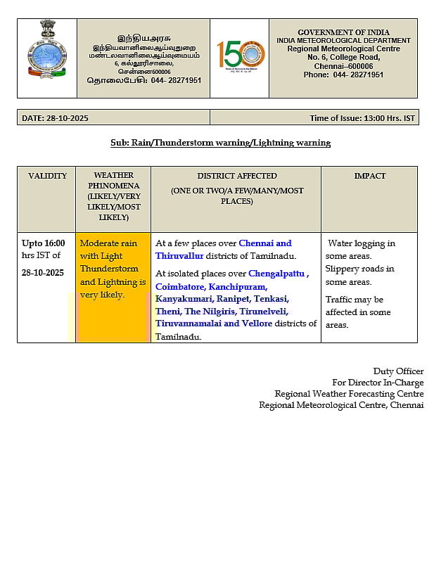 இன்று (அக்.28) சென்னை, செங்கல்பட்டு, காஞ்சிபுரம், ராணிப்பேட்டை, தேனி, தென்காசி, நெல்லை, கன்னியாகுமரி ஆகிய 8 மாவட்டங்களில் இன்று கனமழைக்கு வாய்ப்புள்ளதாகக் கூறப்பட்டுள்ளது.