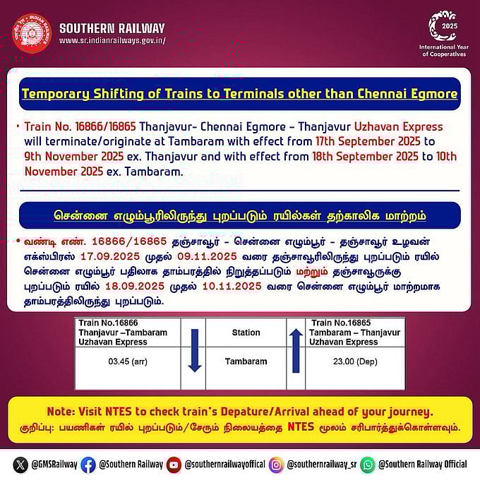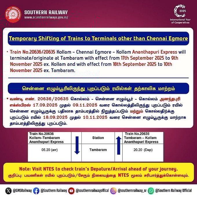 எழும்பூர் ரயில் நிலையத்தில் மேற்கொள்ளப்படும் சீரமைப்புப் பணி காரணமாக எழும்பூர் - தஞ்சாவூர் இடையிலான 'உழவன் எக்ஸ்பிரஸ்' மற்றும் எழும்பூர் - கொல்லம் இடையே இயக்கப்படும் 'அனந்தபுரி எக்ஸ்பிரஸ்' ரயில்கள் வருகிற செப். 18 ஆம் தேதியில் இருந்து தற்காலிகமாக தாம்பரம் ரயில் நிலையத்தில் இருந்து புறப்படும். அதேபோல அங்கிருந்து சென்னைக்கு திரும்பும் ரயில்கள் செப். 17 முதலே தாம்பரத்திலேயே நிறுத்தப்படும் என அறிவிக்கப்பட்டுள்ளது.