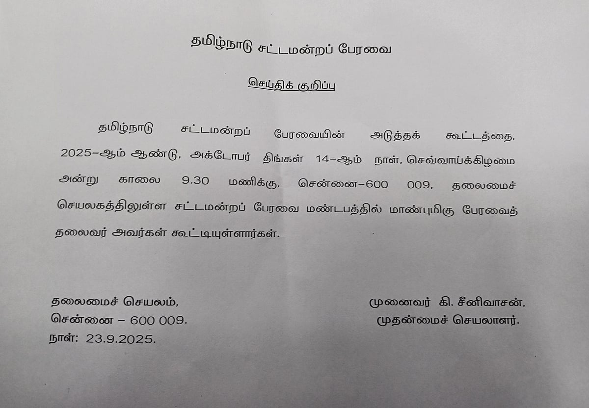 தமிழ்நாடு சட்டப் பேரவைப் பேரவை விதி 26 (1)-இன் கீழ் தமிழக சட்டப் பேரவையின் அடுத்த கூட்டம் வரும் அக். 14-ஆம் தேதி காலை 9.30 மணிக்கு தலைமைச் செயலக வளாகத்தில் அமைந்துள்ள பேரவை மண்டபத்தில் கூடுகிறது. அன்றைய தினம் காலை 9.30 மணிக்கு பேரவை கூடியதும், முன்னாள் எம்எல்ஏக்கள் 8 பேரின் மறைவுக்கு இரங்கல் குறிப்புகள் வாசிக்கப்படும்.