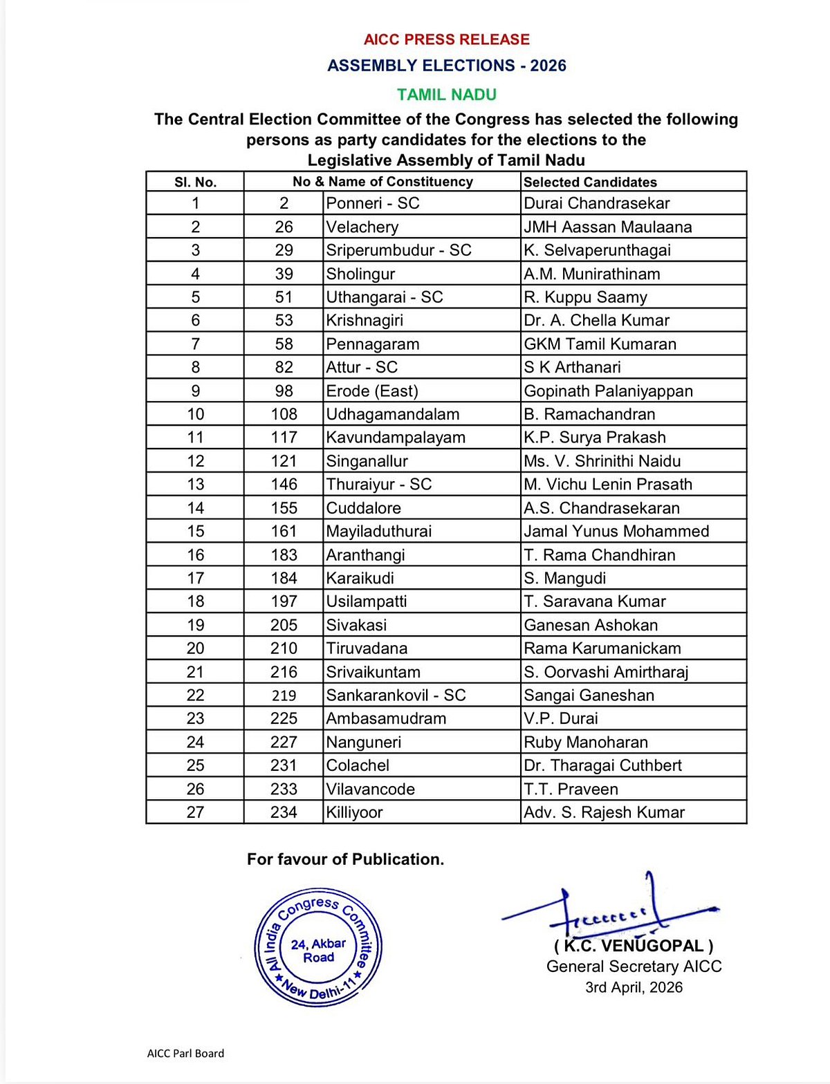 திமுக கூட்டணியில் காங்கிரஸுக்கு ஒதுக்கப்பட்டுள்ள 28 தொகுதிகளில் 27 தொகுதிகளுக்கு இன்று வேட்பாளர்கள் அறிவிக்கப்பட்டுள்ளனர். மதுரை மேலூருக்கு மட்டும் இன்னும் வேட்பாளர் அறிவிக்கப்படவில்லை.