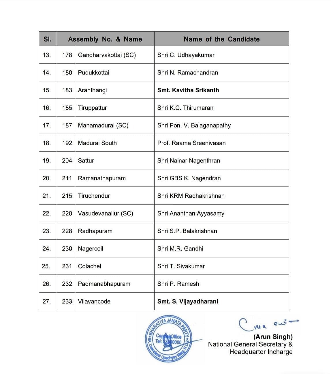 அதிமுக தலைமையிலான தேசிய ஜனநாயகக் கூட்டணியில் பாஜக போட்டியிடும் 27 தொகுதிகளுக்கான வேட்பாளர்கள் பட்டியல் இன்று வெளியானது.
