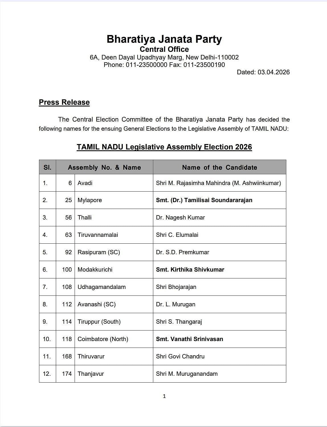 மயிலாப்பூரில் தமிழிசை சௌந்தரராஜன், அவினாசியில் எல். முருகன், கோவை வடக்கில் வானதி சீனிவாசன், சாத்தூரில் நயினார் நாகேந்திரன், விளவங்கோடு தொகுதியில் எஸ். விஜயதாரணி ஆகியோர் போட்டியிடுகின்றனர்.
