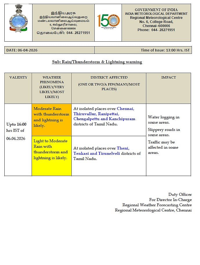 இந்நிலையில் இன்று(ஏப். 6 ) அடுத்த 3 மணி நேரத்துக்கு (மாலை 4 மணி வரை) சென்னை, திருவள்ளூர், ராணிப்பேட்டை, செங்கல்பட்டு, காஞ்சிபுரம் ஆகிய மாவட்டங்களில் மிதமான மழையும்