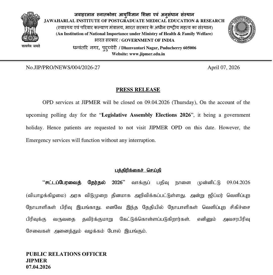 "சட்டப்பேரவைத் தேர்தல் 2026 - வாக்குப் பதிவு நாளை முன்னிட்டு 09.04.2026 (வியாழக்கிழமை) அரசு விடுமுறை தினமாக அறிவிக்கப்பட்டுள்ளது. அன்று ஜிப்மர் வெளிப்புற நோயாளிகள் பிரிவு இயங்காது. எனவே இந்த தேதியில் நோயாளிகள் வெளிப்புற சிகிச்சை பிரிவுக்கு வருவதை தவிர்க்குமாறு கேட்டுக்கொள்ளப்படுகிறார்கள். எனினும் அவசரப் பிரிவு சேவைகள் அனைத்தும் வழக்கம் போல் இயங்கும்" என்று தெரிவிக்கப்பட்டுள்ளது.
