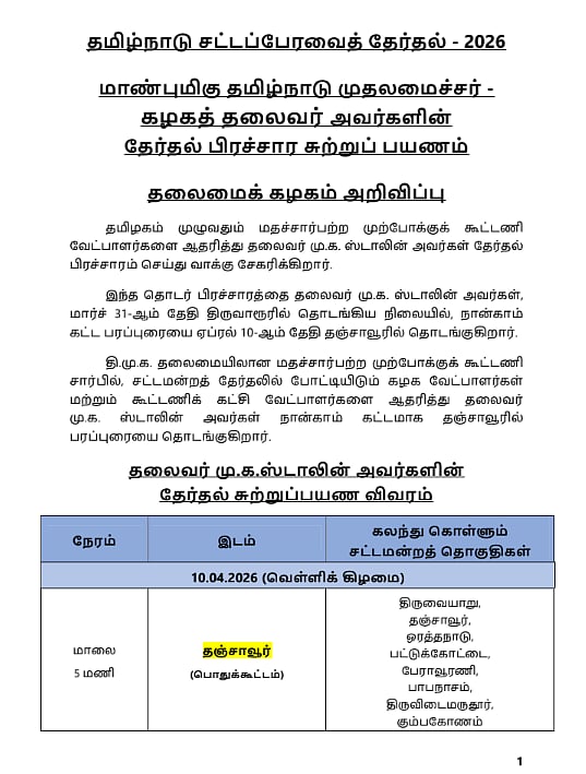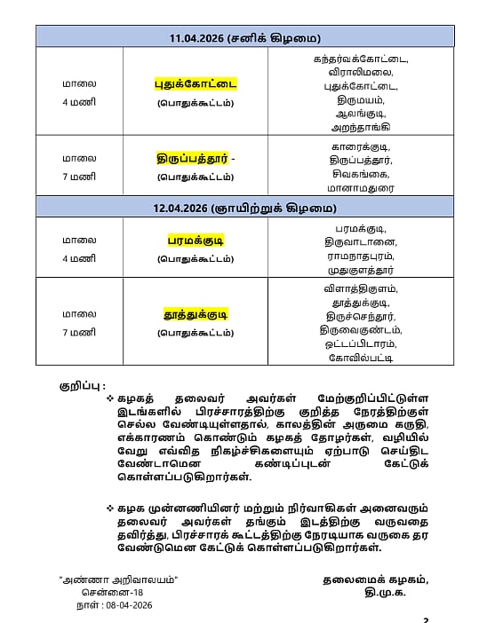 ஏப். 12, ஞாயிற்றுக்கிழமை மாலை 4 மணிக்கு பரமக்குடியிலும் இரவு 7 மணிக்கு தூத்துக்குடியிலும் நடைபெறும் பொதுக் கூட்டத்தில் கலந்துகொண்டு உரையாற்றும் முதல்வர் மு.க. ஸ்டாலின், அந்தந்த மாவட்டத்தைச் சேர்ந்த வேட்பாளர்களை ஆதரித்து வாக்கு சேகரிக்கிறார்" என்று தெரிவிக்கப்பட்டுள்ளது.