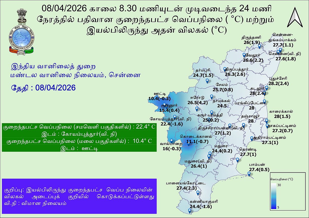 இன்று காலை 8.30 மணியுடன் நிறைவு பெற்ற வெப்பநிலை விவரங்களை சென்னை வானிலை ஆய்வு மையம் வெளியிட்டிருக்கிறது. அதில், கரூர் பரமத்தி 105.08 டிகிரி ஃபாரன்ஹீட், தருமபுரி 102.2 டிகிரி, ஈரோடு 105.08, நாமக்கல் 104, திருப்பத்தூரில் 103.1, திருச்சி 102.38, திருத்தணி 102.02 டிகிரி ஃபாரன்ஹீட், மதுரை நகரம், பாளையங்கோட்டையில் 101. டிகிரி ஃபாரன்ஹீட் வெப்பம் பதிவாகியிருக்கிறது.