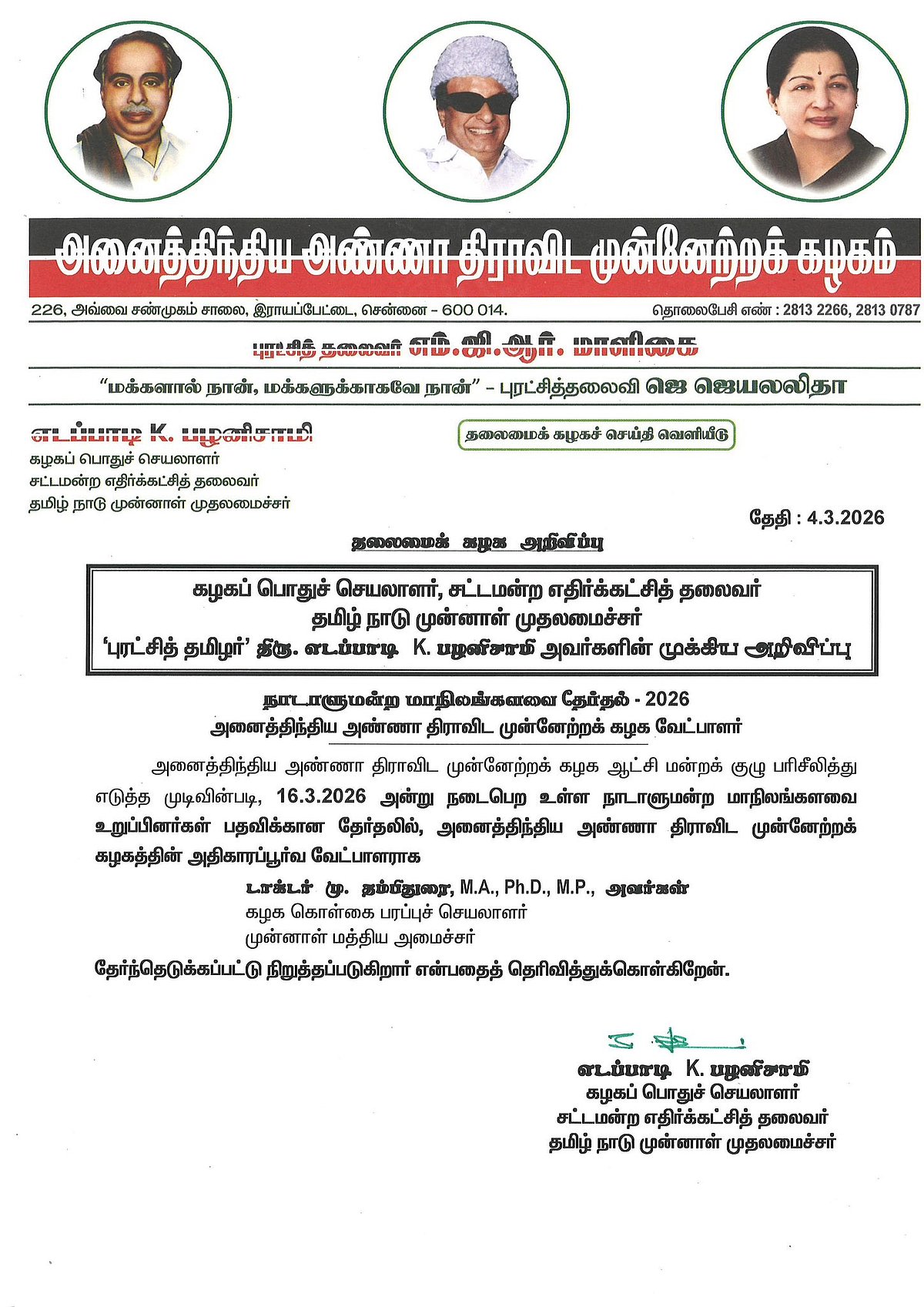 மாநிலங்களவை அதிமுக வேட்பாளர் தம்பிதுரை! பாமகவுக்கு ஒரு இடம்!