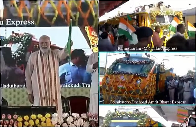 நாகா்கோவில் - சாா்லபள்ளி அம்ரித் பாரத் சிறப்பு ரயில் (06357), கோவை போத்தனூா் - தன்பத் அம்ரித் பாரத் சிறப்பு ரயில் (06619), ராமேசுவரம் - மங்களூா் சிறப்பு விரைவு ரயில் (06621), திருநெல்வேலி - மங்களூா் சிறப்பு விரைவு ரயில் (06708), மயிலாடுதுறை - காரைக்குடி சிறப்பு பயணிகள் ரயில் (06835) ஆகிய 5 ரயில் சேவைகளைத் தொடக்கிவைத்தார்.