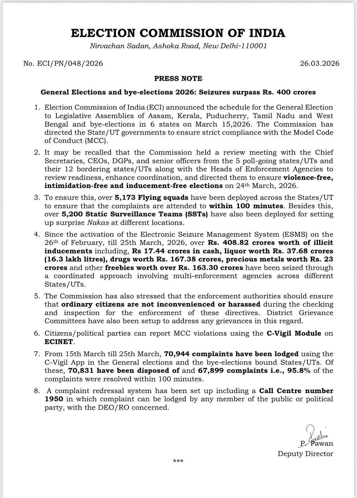 தமிழகம், கேரளம், புதுச்சேரி, அஸ்ஸாம், மேற்கு வங்கம் ஆகிய 5 மாநிலங்கள் மற்றும் இடைத்தேர்தல் நடைபெறும் 6 மாநிலங்களில் நடத்தப்பட்ட சோதனையில் மொத்தமாக இதுவரை ரூ. 408.82 கோடி பணம் மற்றும் பொருள்கள் பறிமுதல் செய்யப்பட்டுள்ளன. இதில் பணமாக ரூ. 17.44 கோடி, மதுபானங்கள் ரூ. 37.68 கோடி, போதைப்பொருள் ரூ. 167.38 கோடி, தங்கம், வெள்ளி உள்ளிட்ட விலைமதிப்புள்ள பொருள்கள் ரூ. 23 கோடி, இலவச பொருள்கள் ரூ. 163.30 கோடி பறிமுதல் செய்யப்பட்டுள்ளதாக தலைமை தேர்தல் ஆணையம் தகவல் தெரிவித்துள்ளது.