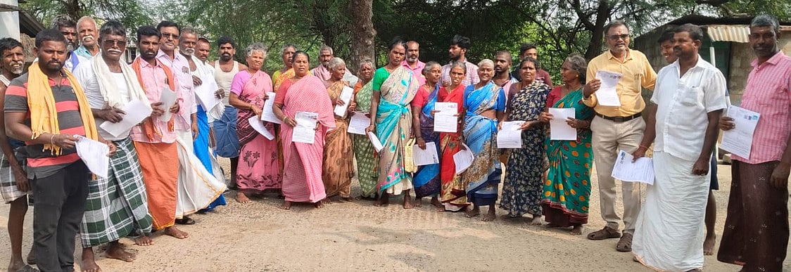 எஸ்.ஐ.ஆா். படிவத்தை பூா்த்தி செய்து அளிக்க எதிா்ப்பு தெரிவித்து போராட்டத்தில் ஈடுபட்ட மேட்டுப்பாளையம் கிராம மக்கள்.