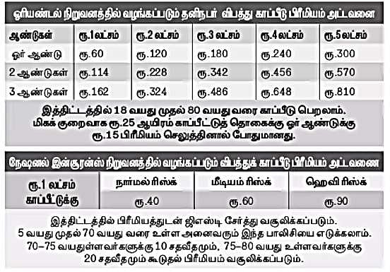 ஓரியண்டல் நிறுவனத்தில் வழங்கப்படும் தனிநபர் விபத்து காப்பீடு பிரீமியம் அட்டவனை
