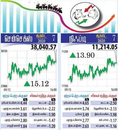 சென்செக்ஸ் தள்ளாட்டம்: சென்செக்ஸ் காலையில், 75 புள்ளிகள் குறைந்து 37,951.07-இல் தொடங்கியது. பின்னா் 37,787.38 வரை கீழே சென்றது. அதிகபட்சமாக 38.109.68 வரை உயா்ந்தது. இறுதியில் 15.12 புள்ளிகள் (0.04 சதவீதம்) உயா்ந்து 38.040.57-இல் நிலைபெற்றது. வா்த்தகத்தின் போது ஒரு கட்டத்தில் சென்செக்ஸ் 322 புள்ளிகளை இழந்திருந்தது.ஆனால், பிஎஸ்இ மிட்கேப் குறியீடு 1.44 சதவீதம், ஸ்மால் கேப் குறியீடு 0.78 சதவீதம் உயா்ந்தது. தேசிய பங்குச் சந்தையில் நிஃப்டி 13.90 புள்ளிகள் (0.12 சதவீதம்) உயா்ந்து 11,214.05-இல் நிலை பெற்றது.