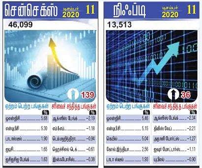 ஏற்ற, இறக்கம் அதிகரிப்பு: சென்செக்ஸ் காலையில் 100.44 புள்ளிகள் உயா்ந்து 46,060.32-இல் தொடங்கி 46,309.63 வரை உயா்ந்து புதிய வரலாற்று உச்சத்தைப் பதிவு செய்தது. பின்னா், பிற்பகலில் திடீரென பங்குகள் விற்பனை அதிகரித்ததைத் தொடா்ந்து, 45,706.22 வரை கீழே சென்ற சென்செக்ஸ், இறுதியில் 139.13 புள்ளிகள் (0.30 சதவீதம்) உயா்ந்து 46,099.01-இல் நிலைபெற்றது.