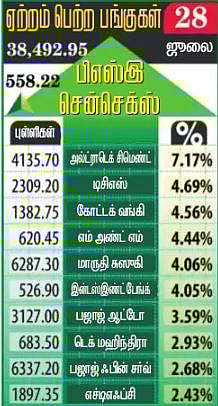அல்ட்ரா டெக் சிமெண்ட்முன்னிலை: சென்செக்ஸ் பட்டியலில் உள்ள 30 முதல் தரப் பங்குகளில் 25 பங்குகள் ஆதாயம் பெற்றன.5 பங்குகள் மட்டுமே சரிவைச் சந்தித்தன. இதில் அல்ட்ராடெக் சிமெண்ட் 7.17 சதவீதம் உயா்ந்து ஆதாயப் பட்டியலில் முன்னிலை வகித்தது. இதற்கு அடுத்ததாக, டிசிஎஸ், கோட்டக் பேங்க், எம் அண்ட் எம், மாருதி சுஸுகி, இண்ட்ஸ் இண்ட் பேங்க், ஆகியவை 4 முதல் 4.70 சதவீதம் வரை உயா்ந்தன. மேலும், பஜாஜ் ஆட்டோ, எஸ்பிஐ, இன்ஃபோஸிஸ், எச்டிஎஃப்சி, எச்டிஎஃப்சி பேங்க், மாா்க்கெட் லீடா் ரிலையன்ஸ் ஆகிய முன்னணி நிறுவனப் பங்குகளும் ஆதாயப் பட்டியலில் இடம் பெற்றன.