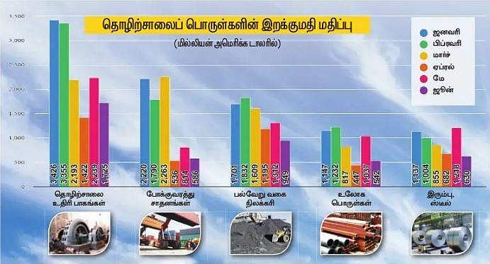 அதேபோல், கடந்த ஆண்டு ஜூன் மாதத்துடன் ஒப்பிடுகையில் கடந்த ஜூன் மாதத்தில் தொழிற்சாலை உதிரி பாகங்கள் உள்ளிட்டவற்றின் இறக்குமதி குறைவாகவே காணப்படுகிறது. இந்தக் காலகட்டத்தில் இரும்புப் பொருள்கள், உலோகங்கள், ஸ்டீல் உள்ளிட்டவற்றின் இறக்குமதி 52 சதவீதமாகவும், நிலக்கரி இறக்குமதி 56 சதவீதமாகவும் குறைந்துள்ளது.