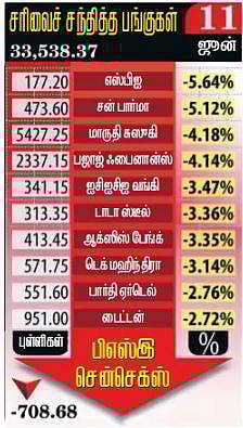 அதேசமயம், பாரம்பரிய பொதுத் துறை வங்கியான எஸ்பிஐ 5.64 சதவீதம் குறைந்து வீழ்ச்சிப் பட்டியலில் முன்னிலை வகித்தது. இதற்கு அடுத்ததாக சன் பாா்மா, மாருதி, பஜாஜ் ஃபைனான்ஸ் ஆகியவை 4 முதல் 5 சதவீதம் சரிவைக் கண்டன. ஐசிஐசிஐ பேங்க், டாடா ஸ்டீல், ஆக்ஸிஸ் பேங்க், டெக் மகேந்திரா ஆகியவை 3 முதல் 4 சதவீதம் வரை குறைந்தன. முன்னணி நிறுவனங்களான ரிலையன்ஸ், ஹெச்டிஎஃப்சி பேங்க், அல்ட்ரா டெக் சிமெண்ட் கோட்டக் பேங்க், ஐடிசி ஆகியவையும் 2 முதல் 3 சதவீதம் வரை குறைந்து வீழ்ச்சிப் பட்டியலில் இடம் பெற்றன.