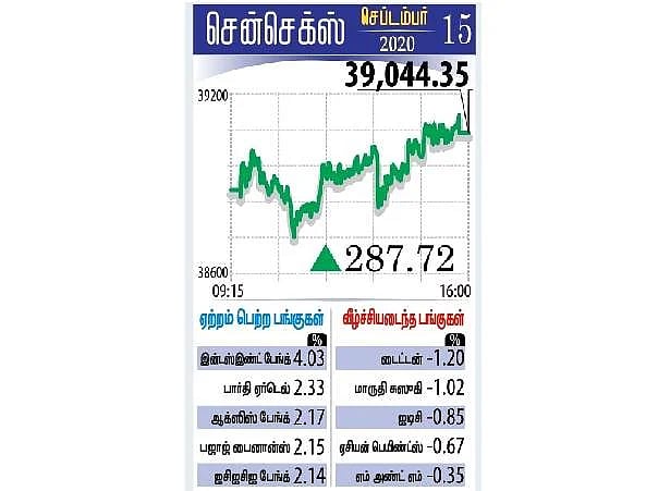 எழுச்சி: சென்செக்ஸ் காலையில் 148.04 புள்ளிகள் கூடுதலுடன் 38,904.67-இல் தொடங்கி 39,102.25 வரை கீழே சென்றது. பின்னர் பிற்பகலில் முதல் தரப் பங்குகளை வாங்குவதற்கு ஆதரவு கிடைத்ததும் 39,102.25 வரை உயர்ந்த சென்செக்ஸ், இறுதியில், 287.72 புள்ளிகள் உயர்ந்து 39,044.35-இல் நிலைபெற்றது. இதேபோல பிஎஸ்இ மிட்கேப் குறியீடு 0.85 சதவீதம், ஸ்மால் கேப் குறியீடு 1.44 சதவீதம் உயர்ந்தன. தேசிய பங்குச் சந்தையில் நிஃப்டி 81.75 புள்ளிகள் (0.71) உயர்ந்து 11,521.80-இல் நிலைபெற்றது. நிஃப்டி அதிகபட்சமாக 11,535.95 வரை உயர்ந்தது.