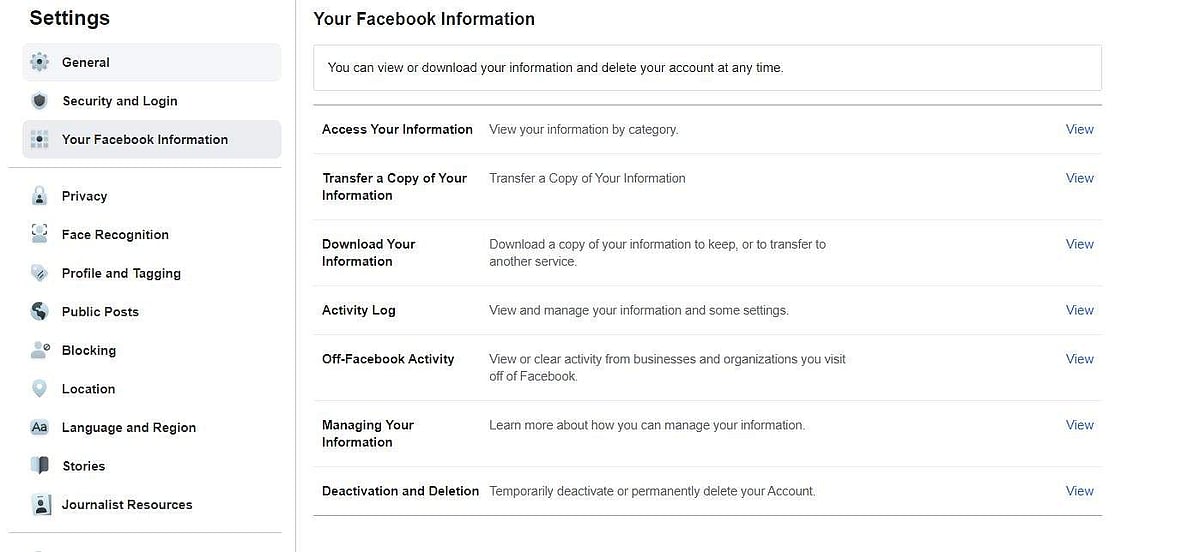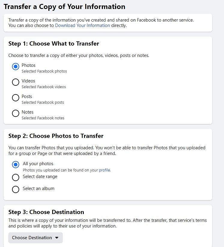 இதற்காக நீங்கள் பேஸ்புக் பக்கத்தில் Settings & Privacy -> Settings->Your Facebook Information->Transfer Your Information என்பதை கிளிக் செய்ய வேண்டும்.