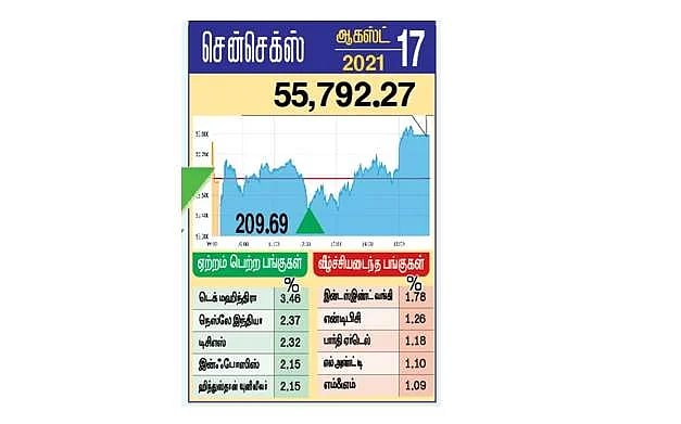 மும்பை பங்குச் சந்தைக் குறியீட்டு எண்ணான சென்செக்ஸ் செவ்வாய்க்கிழமை மேலும் 210 புள்ளிகள் உயர்ந்து 56,000 புள்ளிகளை நெருங்கியது. சென்செக்ஸ் பட்டியலில் இடம் பெற்றுள்ள முன்னணி நிறுவனப் பங்குகளான இன்ஃபோஸிஸ், டிசிஎஸ், ஹிந்துஸ்தான் யுனி லீவர் மற்றும் டெக் மஹிந்திரா ஆகியவை வெகுவாக உயர்ந்து சென்செக்ஸ் ஏற்றத்துக்கு முக்கியக் காரணமாக இருந்தன.