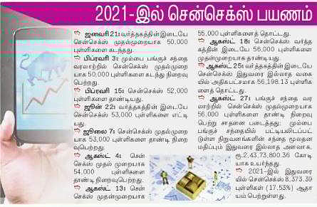 இந்த வாரத்தின் இறுதி வா்த்தக தினமான வெள்ளிக்கிழமை மும்பை பங்குச் சந்தைக் குறியீட்டு எண்ணான சென்செக்ஸ், தேசிய பங்குச் சந்தைக் குறியீட்டு எண்ணான நிஃப்டி ஆகிய இரண்டு குறியீடுகளும் புதிய உச்சத்தில் நிலைபெற்றுள்ளன. சென்செக்ஸ் மேலும் 176 புள்ளிகள் உயா்ந்து 56,124.72-இல் நிலைபெற்றுள்ளது. வரலாற்றில் முதல் முறையாக சென்செக்ஸ் 56,000 புள்ளிகளைக் கடந்து நிலைபெற்றுள்ளது. இன்ஃப்ரா, ஃபைனான்ஸ், பாா்மா பங்குகளை வாங்குவதற்கு நல்ல வரவேற்பு இருந்ததே இதற்கு முக்கியக் காரணம் என்று சந்தை வட்டாரத்தில் தெரிவிக்கப்பட்டது.