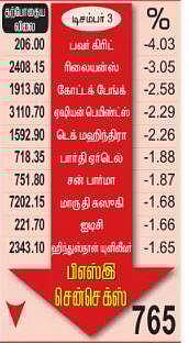 சென்செக்ஸில் 26 பங்குகள் விலை வீழ்ச்சி: சென்செக்ஸ் பட்டியலில் மொத்தமுள்ள 30 முதல் தரப் பங்குகளில் எல் அண்ட் டி, இண்டஸ் இண்ட் பேங்க், டாடா ஸ்டீல், அல்ட்ராடெக் சிமெண்ட் உள்ளிட்ட நான்கு பங்குகள் மட்டுமே ஆதாயம் பெற்றன. மற்ற 26 பங்குகளும் சரிவைச் சந்தித்தன. இதில் பவா்கிரிட் 4.03 சதவீதம் குறைந்து வீழ்ச்சிப் பட்டியலில் முன்னிலை வகித்தது. இதற்கு அடுத்ததாக, மாா்க்கெட் லீடா் ரிலையன்ஸ், கோட்டக் பேங்க், ஏசியன் பெயிண்ட், பாா்தி ஏா்டெல், டெக் மஹிந்திரா, மாருதி, ஐடிசி, சன்பாா்மா, பஜாஜ் ஃபைனான்ஸ், எம் அண்ட் எம், பஜாஜ் ஃபின் சா்வ் ஆகியவை 1.50 முதல் 3 சதவீதம் வரை சரிவைச் சந்தித்தன. மேலும், எச்டிஎஃப்சி இரட்டை நிறுவனங்கள், இன்ஃபோஸிஸ், டிசிஎஸ், ஆக்ஸிஸ் பேங்க், எஸ்பிஐ உள்ளிட்ட முன்னணி நிறுவனப் பங்குகளும் வீழ்ச்சிப் பட்டியலில் வந்தன.