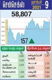 பங்குச் சந்தையில் வியாழக்கிழமை ஏற்றம், இறக்கம் அதிகரித்து இருந்தது. இருப்பினும், மும்பை பங்குச் சந்தைக் குறியீட்டு எண்ணான சென்செக்ஸ் மேலும் 157 புள்ளிகள் உயா்ந்து 58,807.13-இல் நிலைபெற்றது.