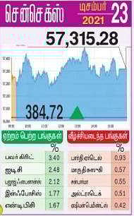 ‘காளை’ தொடா்ஆதிக்கம்: காலையில் சென்செக்ஸ் 320.59 புள்ளிகள் கூடுதலுடன் 57,251.15-இல் தொடங்கி ஒரு கட்டத்தில் 57,146.28 வரை கீழே சென்றது. பின்னா், ‘காளை’யின் ஆதிக்கம் கடுமையானதால், அதிகபட்சமாக 57490.52 வரை உயா்ந்த சென்செக்ஸ், இறுதியில் 384.72 புள்ளிகள் (0.68 சதவீதம்) கூடுதலுடன் 57,315.28-இல் நிலைபெற்றது. 30 முதல் தரப் பங்குகளை உள்ளடக்கிய சென்செக்ஸ் பட்டியலில் 10 பங்குகள் வீழ்ச்சி கண்டன. 20 பங்குகள் ஆதாயம் பெற்றன.