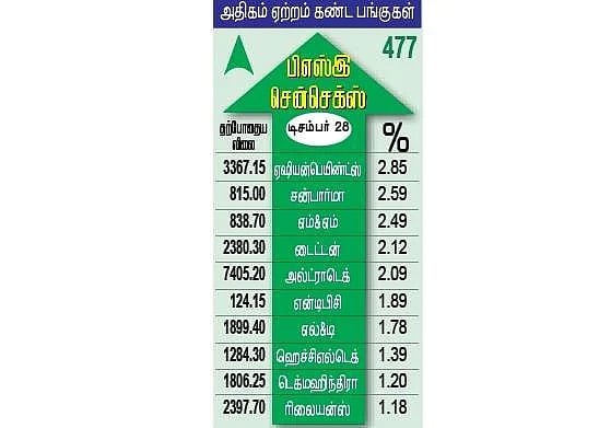 மேலும், முன்பேர வர்த்தகத்தில் டிசம்பர் மாத கான்ட்ராக்டுகள் கணக்கு முடிக்க இன்னும் இரண்டு நாள்களே உள்ளதால், ஏற்கெனவே பங்குகளை விற்றிருந்தவர்கள் அவற்றை வாங்குவதில் கவனம் செலுத்தி வருவதும் சந்தை ஏற்றம் பெறக் காரணமாகும் என்று வர்த்தகர்கள் தெரிவித்தனர்.