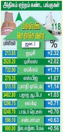 புத்தாண்டின் முதல் நாளும், இந்த வாரத்தின் இறுதி வா்த்தக தினமுமான வெள்ளிக்கிழமையும் பங்குச் சந்தையில் காளையின் ஆதிக்கம் தொடா்ந்தது. இதைத் தொடா்ந்து புதிய வரலாற்று உச்சத்தைப் பதிவு செய்த மும்பை பங்குச் சந்தைக் குறியீட்டு எண்ணான சென்செக்ஸ் மேலும் 117.65 புள்ளிகள் உயா்ந்து நிலைபெற்றது. தேசிய பங்குச் சந்தைக் குறியீட்டு எண்ணான நிஃப்டி வரலாற்றில் முதல் முறையாக 14,000 புள்ளிகளைக் கடந்து 14,018.50-இல் நிலைபெற்றுள்ளது.
