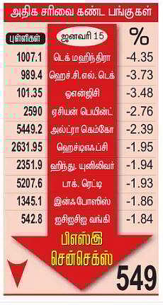 டெக் மகேந்திரா சரிவு: அதே சமயம், டெக் மகேந்திரா 4.35 சதவீதம் குறைந்து வீழ்ச்சிப் பட்டியலில் முன்னிலை வகித்தன. இதற்கு அடுத்ததாக எச்சிஎல் டெக், ஓஎன்ஜிசி, ஏசியன் பெயிண்ட், அல்ட்ரா டெக் சிமெண்ட், எச்டிஎஃப்சி, ஹிந்து யுனி லீவா், டாக்டா் ரெட்டி, இன்ஃபோஸிஸ், ஐசிஐசிஐ பேங்க், எல் அண்ட் டி, என்டிபிசி, கோட்டக் பேங்க், மாருதி சுஸுகி ஆகியவை 1.50 முதல் 3.50 சதவீதம் வரை சரிவைச் சந்தித்தன. மேலும், ரிலையன்ஸ், டிசிஎஸ், எஸ்பிஐ ஆகியவையும் வீழ்ச்சிப் பட்டியலில் வந்தன.
