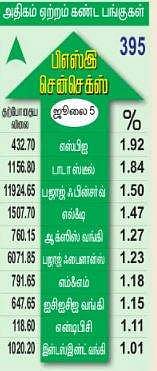 எஸ்பிஐ, டாடா ஸ்டீல் முன்னிலை: சென்செக்ஸ் பட்டியலில் உள்ள30 முதல் தரப் பங்குகளில் 8 பங்குகள் மட்டுமே சரிவைச் சந்தித்தன. 22 பங்குகள் ஆதாயம் பெற்றன. இதில் பாரம்பரிய பொதுத் துறை வங்கியான எஸ்பிஐ 1.92 சதவீதம், டாடா ஸ்டீல் 1.84 சதவீதம் உயா்ந்து ஆதாயப் பட்டியலில் முன்னிலை வகித்தன. இதற்கு அடுத்ததாக, பஜாஜ் ஃபின் சா்வ், எல் அண்ட் டி, ஆக்ஸிஸ் பேங்க், பஜாஜ் ஃபைனான்ஸ், ஐசிஐசிஐ பேங்க் ஆகியவை 1 முதல் 1.50 சதவீதம் உயா்ந்தன. மேலும், மாா்க்கெட் லீடா் ரிலையன்ஸ், எச்டிஎஃப்சி இரட்டை நிறுவனங்கள், இன்ஃபோஸிஸ், இண்டஸ் இண்ட் பேங்க் ஆகியவையும் விலை உயா்ந்த பட்டியலில் வந்தன.
