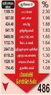 டாடா ஸ்டீல் சரிவு: சென்செக்ஸ் பட்டியலில் உள்ள30 முதல் தரப் பங்குகளில் 6 பங்குகள் மட்டுமே ஆதாயம் பெற்றன. 24 பங்குகள் சரிவைச் சந்தித்தன. இதில் புதன்கிழமை வெகுவாக ஏற்றம் கண்டிருந்த டாடா ஸ்டீல், வியாழக்கிழமை 2.30 சதவீதம் குறைந்து வீழ்ச்சிப் பட்டியலில் முன்னிலை வகித்தது. இதற்கு அடுத்ததாக சன்பாா்மா, எஸ்பிஐ, ஐசிஐசிஐ பேங்க், டாக்டா் ரெட்டி, கோட்டக் பேங்க், ஹெச்யுஎல், பஜாஜ் ஃபைனான்ஸ், எச்டிஎஃப்சி பேங்க், ஆக்சிஸ் பேங்க் உள்ளிட்டை 1-2 சதவீதம் வரை சரிவைச் சந்தித்தன. மேலும், ரிலையன்ஸ், மாருதி சுஸுகி, எச்டிஎஃ)ப்சி, டிசிஎஸ், இன்ஃபோஸிஸ் உள்ளிட்ட முன்னணி நிறுவனங்களும் விலை குறைந்த பட்டியலில் வந்தன. அதேசமயம், டெக் மஹிந்திரா 1.39 சதவீதம் உயா்ந்து ஆதாயப் பட்டியலில் முன்னிலை வகித்தது. மேலும், பஜாஜ் ஆட்டோ, ஹெச்சிஎல் டெக், பவா் கிரிட், என்டிபிசி, இண்டஸ் இண்ட் பேங்க் ஆகியவை சிறிதளவு உயா்ந்தன.