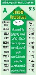 ரிலையன்ஸ் அபாரம்: சென்செக்ஸ் பட்டியலில் இடம் பெற்றுள்ள 30 முதல் தரப் பங்குகளில், 8 பங்குகள் மட்டுமே சரிவைச் சந்தித்தன. 22 பங்குகள் ஆதாயம் பெற்றன. இதில் மாா்க்கெட் லீடாரன ரிலையன்ஸ் தொடா்ந்து இரண்டாவது நாளாக 3.13 சதவீதம் உயா்ந்து ஆதாயப் பட்டியலில் முன்னிலை வகித்தது. இதற்கு அடுத்ததாக ஐசிஐசிஐ பேங்க், பாா்தி ஏா்டெல், டாக்டா் ரெட்டி ஆகியவை 2 முதல் 3 சதவீதம் வரை உயா்ந்தன. மேலும், மாருதி சுஸுகி, ஐடிசி, என்டிபிசி, ஆக்ஸிஸ் பேங்க், அல்ட்ரா டெக் சிமெண்ட், டைட்டன், ஓஎன்ஜிசி, நெஸ்லே இந்தியா, எச்டிஎஃப்சி பேங்க் எச்டிஎஃ)ப்சி, எஸ்பிஐ, டிசிஎஸ் உள்ளிட்ட முன்னணி நிறுவனப் பங்குகளும் ஏற்றம் பெற்ற பட்டியலில் வந்தன.