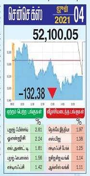 தள்ளாட்டம்...: சென்செக்ஸ் காலையில் 135.09 புள்ளிகள் கூடுதலுடன் 52,367.52-இல் தொடங்கி 52,389.02 வரை உயா்ந்தது. பின்னா், 51,952.70 வரை கீழே சென்ற சென்செக்ஸ் இறுதியில் 132.38 புள்ளிகளை (0.25 சதவீதம்) இழந்து 52,100.05-இல் நிலைபெற்றது. வா்த்தகத்தின் போது ஒரு கட்டத்தில் அதிகபட்ச நிலையிலிருந்து 436.32 புள்ளிகளை இழந்திருந்தது.