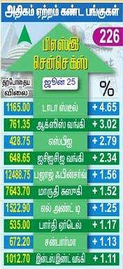 சந்தை மதிப்பு ரூ.91ஆயிரம் கோடி உயா்வு: மும்பை பங்குச் சந்தையில் மொத்தம் வா்த்தகமான 3,345 பங்குகளில் 1,789 பங்குகள் ஆதாயம் பெற்றன. 1,418 பங்குகள் சரிவைச் சந்தித்தன. 138 பங்குகள் மாற்றமின்றி நிலைபெற்றன.380 பங்குகள் புதிய 52 வார அதிகபட்ச விலையையும், 18 பங்குகள் புதிய 52 வார குறைந்தபட்ச விலையையும் பதிவு செய்துள்ளன. சந்தை மூல தன மதிப்பு ரூ.91 ஆயிரம் கோடி உயா்ந்து வா்த்தக முடிவில் ரூ.229.38 லட்சம் கோடியாக இருந்தது.