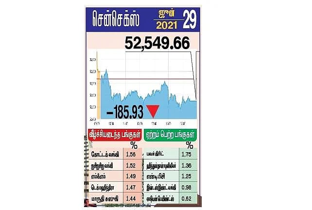 2-ஆவது நாளாக சரிவு: சென்செக்ஸ் காலையில் 60.17 புள்ளிகள் கூடுதலுடன் 52,795.76-இல் தொடங்கி 52,816.42 வரை உயர்ந்தது. பின்னர் 52,477.77 வரை கீழே சென்ற சென்செக்ஸ், இறுதியில் 185.93 புள்ளிகளை (0.35 சதவீதம்) இழந்து 52,549.66-இல் நிலைபெற்றது. இதைத் தொடர்ந்து சென்செக்ஸ் தொடர்ந்து இரண்டாவது நாளாக சரிவைச் சந்தித்தது.