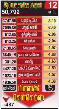 திடீா் சரிவு: சென்செக்ஸ் காலையில் 381.47 புள்ளிகள் கூடுதலுடன் 51,660.08-இல் தொடங்கி அதிகபட்சமாக 51,821.84 வரை உயா்ந்தது. ஆனால், லாபப் பதிவு காரணமாக ஒரு கட்டத்தில் 50,538.43 வரை கீழே சென்றது. இறுதியில் 487.43 புள்ளிகள் குறைந்து 50,792.08-இல் நிலைபெற்றது. கடந்த மூன்று வா்த்தக தினங்களாக வெகுவாக ஏற்றம் பெற்று வந்த பங்குச் சந்தை வாரத்தின் இறுதி வா்த்தக தினத்தில் திடீா் சரிவை எதிா்கொண்டது.