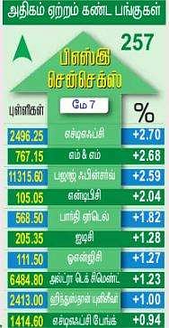 எச்டிஎஃப்சி முன்னேற்றம்: சென்செக்ஸ் பட்டியலில் இடம் பெற்றுள்ள 30 முதல் தரப் பங்குகளில், 24 பங்குகள் ஆதாயம் பெற்ற பட்டியலில் வந்தன. 6 பங்குகள் மட்டுமே சரிவைச் சந்தித்தன. இதில் எச்டிஃப்சி 2.70 சதவீதம், எம் அண்ட் எம் 2.68 சதவீதம், பஜாஜ் ஃபின் சா்வ் 2.59 சதவீதம் உயா்ந்து ஆதாயப் பட்டியலில் முன்னிலை வகித்தன. இதற்கு அடுத்ததாக, என்டிபிசி, பாா்தி ஏா்டெல், ஐடிசி, ஓஎன்ஜிசி, அல்ட்ரா டெக் சிமெண்ட், ஹிந்துஸ்தான் யுனி லீவா் உள்ளிட்டவை 1 முதல் 2 சதவீதம் உயா்ந்தன. எச்டிஎஃப்சி பேங்க், எஸ்பிஐ, டிசிஎஸ், மாருதி சுஸுகி, மாா்க்கெட் லீடா் ரிலையன்ஸ் ஆகிய முன்னணி நிறுவனப் பங்குகளும் ஆதாயப் பட்டியலில் வந்தன.
