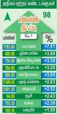 தேசிய பங்குச் சந்தையில்...: தேசிய பங்குச் சந்தையில் 986 பங்குகள் ஆதாயம் பெற்றன. 736 பங்குகள் வீழ்ச்சியைச் சந்தித்தன. நிஃப்டி 98.35 புள்ளிகள் (0.67 சதவீதம்) உயா்ந்து 14,823.15-இல் நிலைபெற்றது. காலையில் 14,816.85-இல் தொடங்கி 14,863.05 வரை மேலே சென்றது. பின்னா் 14,765.50 வரை கீழே சென்றது. நிஃப்டி பட்டியலில் உள்ள 50 முதல் தரப்பங்குகளில் 33 பங்குகள் ஆதாயம் பெற்றன. 17 பங்குகள் வீழ்ச்சியைச் சந்தித்தன. நிஃப்டி மெட்டல் குறியீடு 4.71 சதவீதம் உயா்ந்து ஆதாயப் பட்டியலில் முன்னிலை வகித்தது. நிஃப்டி பிஎஸ்யு பேங்க் குறியீடு தவிர மற்ற அனைத்துத் துறை குறியீடுகளும் ஏற்றம் பெற்ற பட்டியலில் வந்தன.